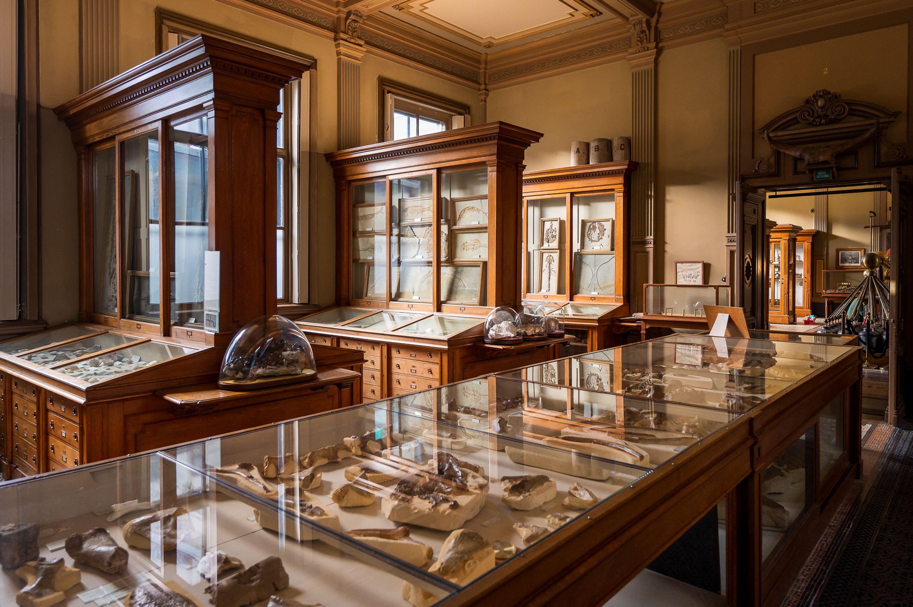 Teylers Museum’s collection of fossils comprises approximately 75,000 fossilized remains and traces of extinct plants and animals. It includes pieces known around the world, like the first example ever found of a Mosasaurus, or lizard of the Meuse River, and the famous ‘Zondvloedmens-fossiel’, or deluge man fossil. Fossils played an important role in debates about the origin of life and the age of the earth. The museum acquired them when palaeontology, or the study of fossils, was developing into a science – but they are still actively studied today.