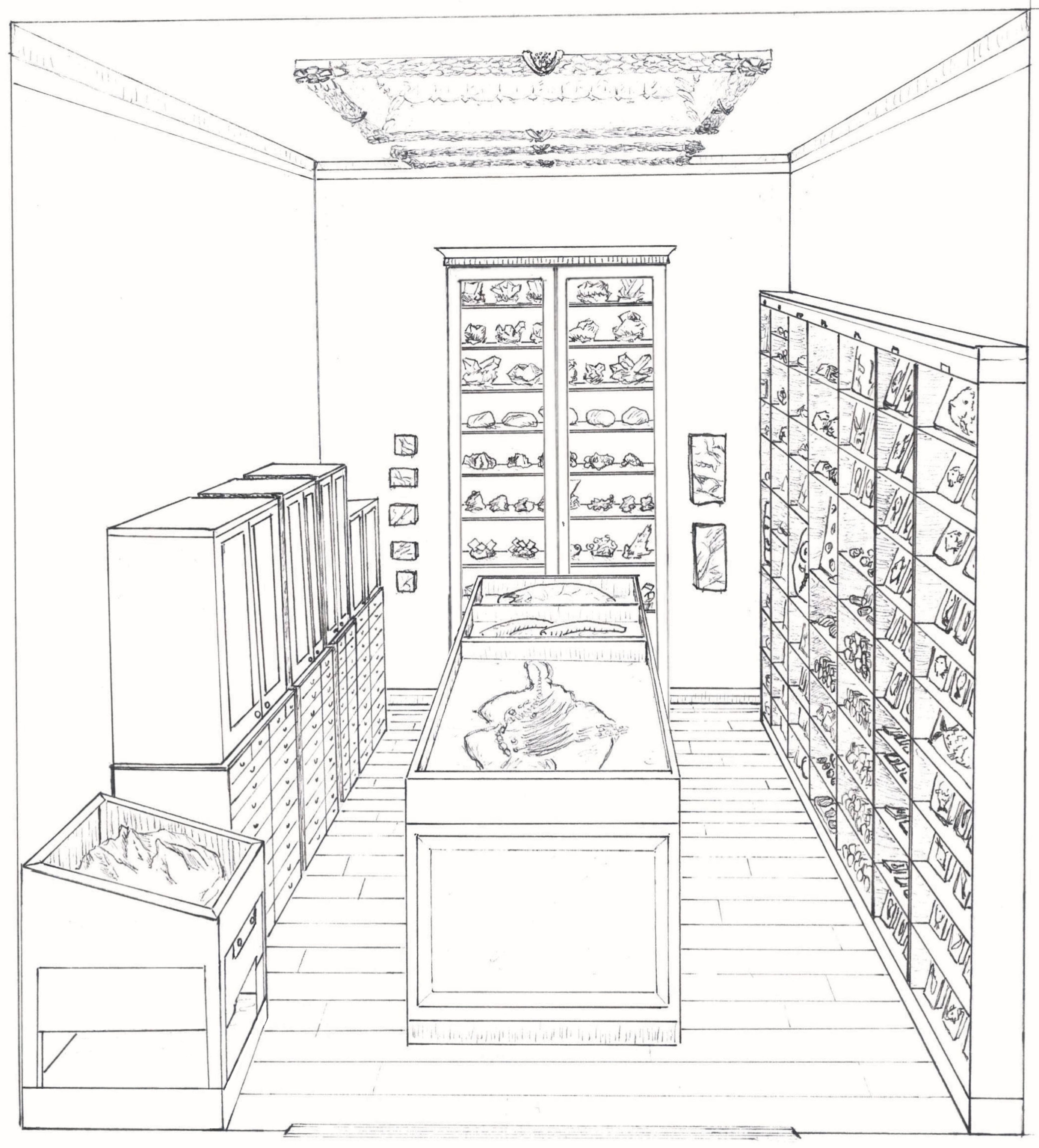 Artist impression van de Kleine Kamer (nu het Numismatisch Kabinet) van het Paleontologisch Museum, 1840-1884.