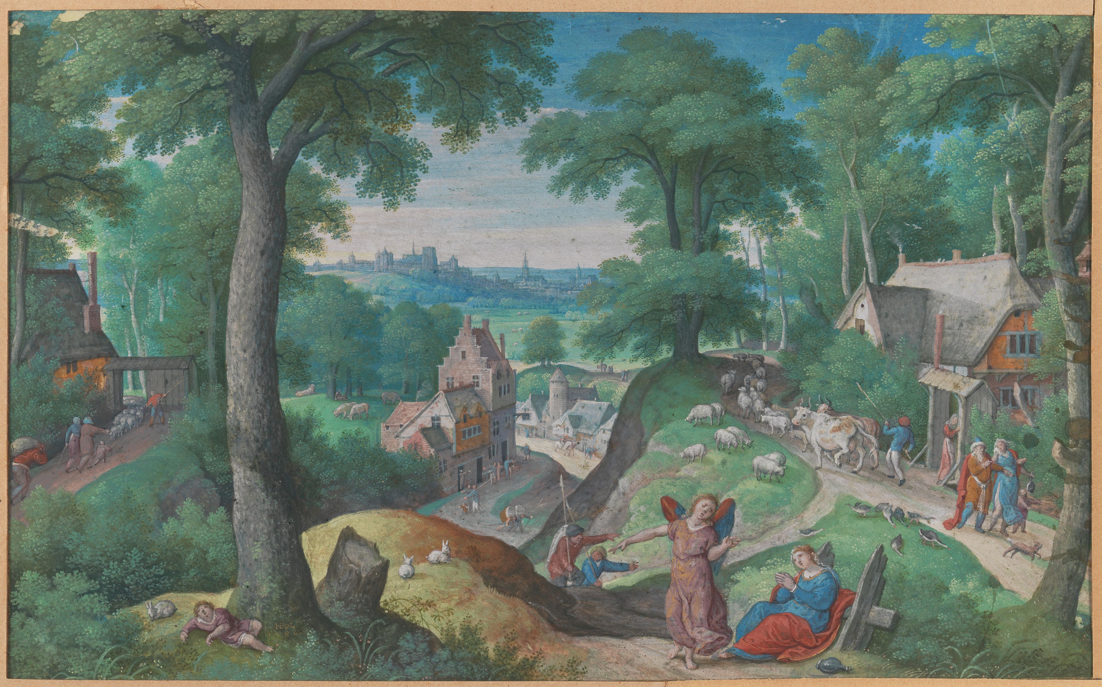Ook in deze spectaculair gekleurde tekening van Hans Bol (1534-1593) speelt het landschap een prominente rol. De glooiende heuvels met in de verte een stad vormen het toneel voor een verhaal uit het Oude Testament. De tekening is uitgevoerd met gouacheverf (dekkende waterverf), waardoor het net een schilderij op papier is. Om de voorstelling wat cachet te geven voegde Bol enkele details met goudverf toe, met name in het gewaad van de engel op de voorgrond. Daarnaast tekende hij de voorstelling niet op gewoon papier, maar op kostbaar perkament. Het gaat dus om een zeer luxueus uitgevoerde tekening, bedoeld als zelfstandig kunstwerk.