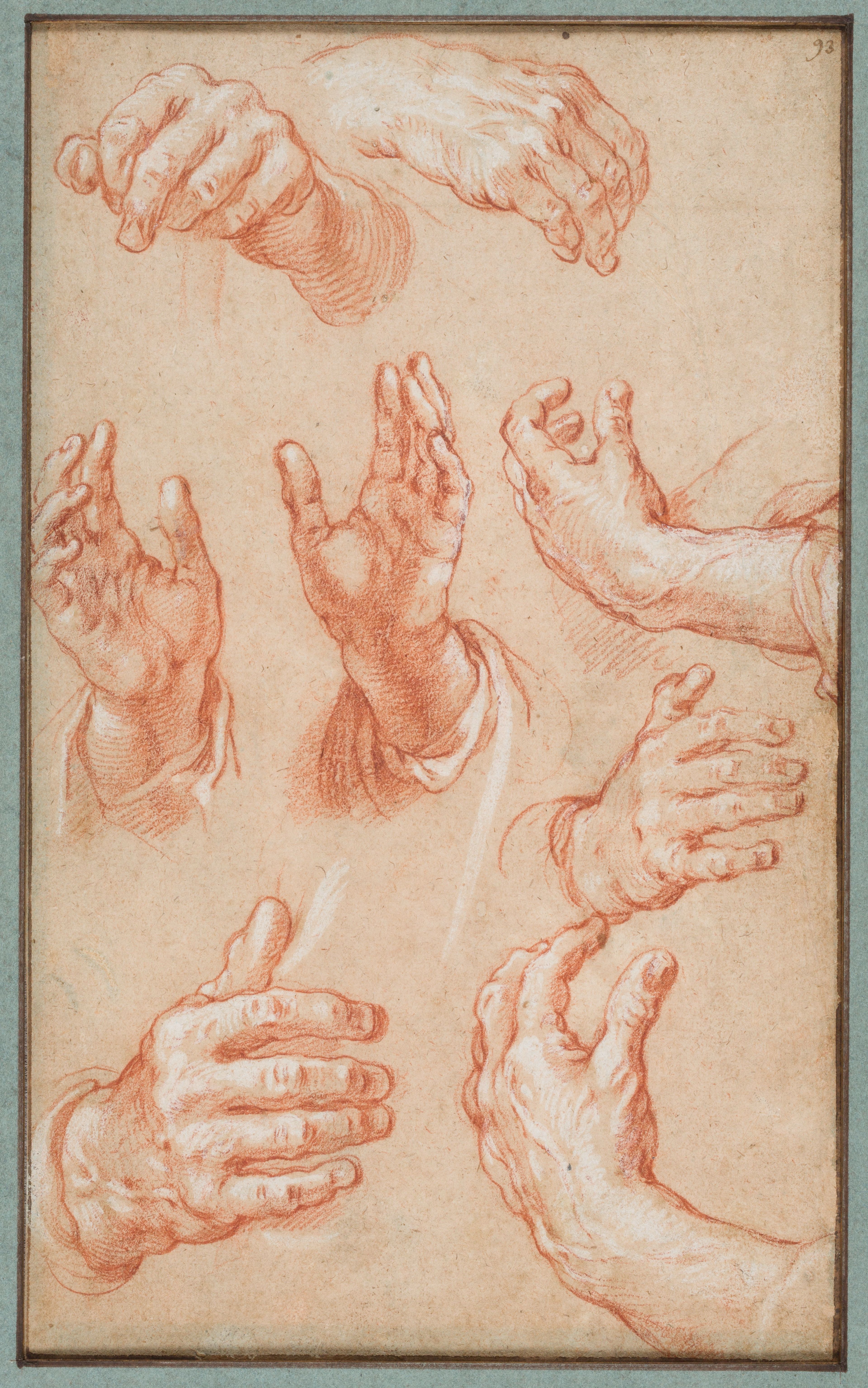 Deze tekening gevuld met diverse studies van handen in allerlei posities heeft dan weer een andere functie. Het is bedoeld als studieblad. De maker ervan is Abraham Bloemaert (1566-1651), een Utrechtse kunstenaar die een belangrijke vertegenwoordiger was van het Noord-Nederlandse maniërisme. Typerend voor deze kunststroming zijn dynamische voorstellingen met elegante figuren, waarbij expressieve handgebaren een belangrijke rol spelen. Handen tekenen is ontzettend moeilijk – zelf Rembrandt slaagde er niet altijd in dit correct te doen.