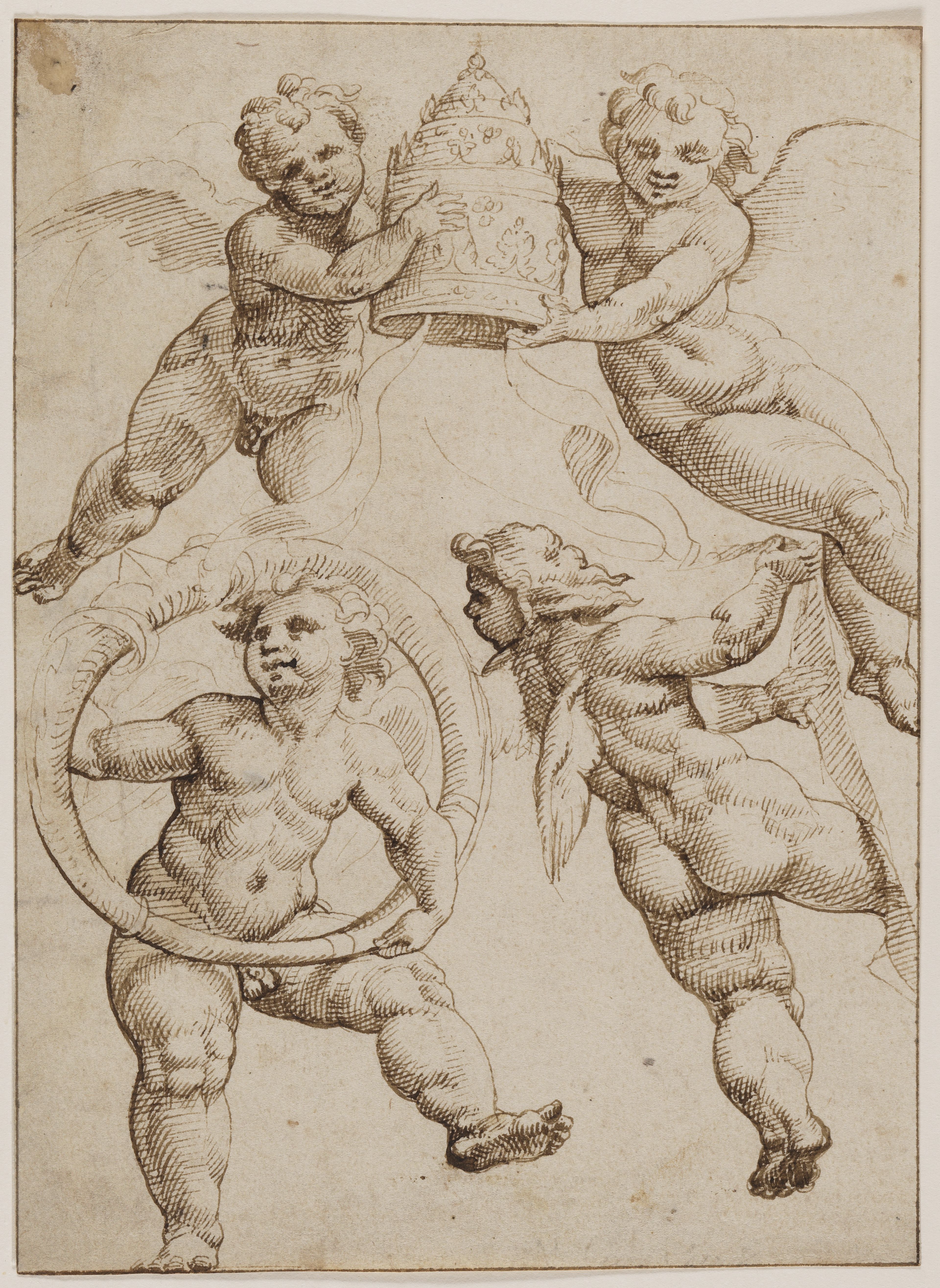 Net als Bloemaert was Maarten van Heemskerck (1498-1574) ook een maniëristisch kunstenaar. Hij liet zich inspirerend door Italiaanse kunstenaars, waaronder Michelangelo en Rafael. Deze tekening maakte hij tijdens een studiereis in Rome. De dartelende putti met de emblemen van Paus Leo X nam hij over van een fresco dat Rafael in de Sala di Constantino in het Vaticaan had geschilderd.