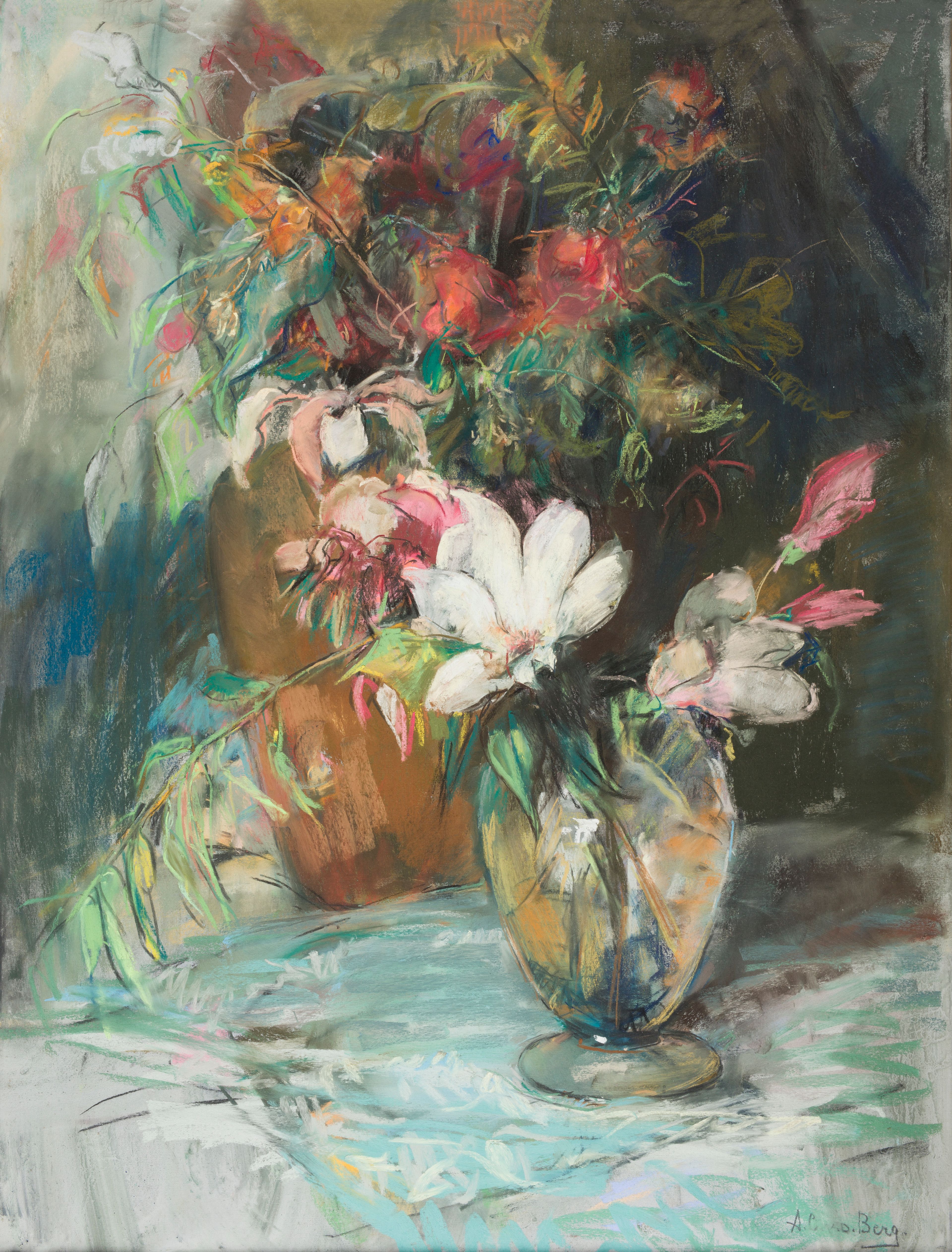 Anna Carolina van den Berg (1873-1942), beter bekend als Ans, is de enige van de Amsterdamse Joffers die haar opleiding tot kunstenaar niet aan de Rijksakademie van Amsterdam volgt. In 1903 en 1904 studeert ze aan de Académie Colarossi, een privé-kunstacademie in Parijs. Daarnaast krijgt Ans schilderles van Willy Dijsselhof-Keuchenius (1865-1960) en leert ze het realistisch tekenen van het menselijk lichaam van Amsterdamse Joffer Jo Bauer-Stumpff (1873-1964). Uiteindelijk specialiseert Ans van den Berg zich in het schilderen en tekenen van bloemstillevens. Teylers Museum heeft twee van haar impressionistische bloemstukken in de collectie. Op de met felle kleuren getekende pastel 'Magnolia tak in een vaas' zijn haar snelle halen met het krijt nog goed zichtbaar.